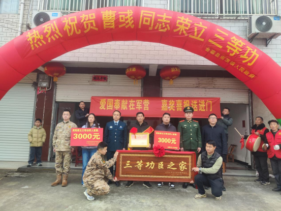 日前,武警北京总队某支队与金寨县人武部、县退役军人事务局联合组成送喜报工作组前往金寨县南溪镇,为荣立三等功的现役军人曹彧家庭送上立功喜报、荣誉牌匾和慰问金。
