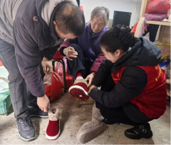 活动中,志愿者们携带米、油、保暖棉鞋等慰问品,逐一走进烈属家中,与老人们促膝交谈,细致询问他们的身体健康状况与日常生活需求,细心为老人修剪头发,帮他们换上崭新的棉鞋,并在门窗贴上喜庆的“福”字窗花,让屋内顿时洋溢起节日的暖意。